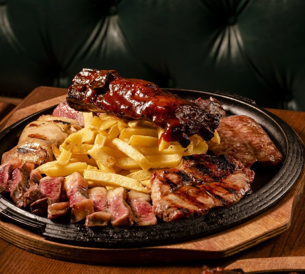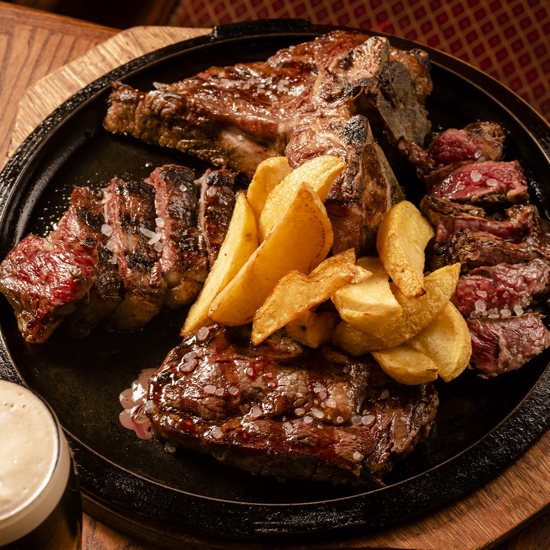 Only for true red meat lovers! 1.5 kg of beef cooked on the grill and served on a cast iron grill with baked potatoes. Here are the cuts you'll find: T-bone, beef tenderloin, Patagonia Angus.