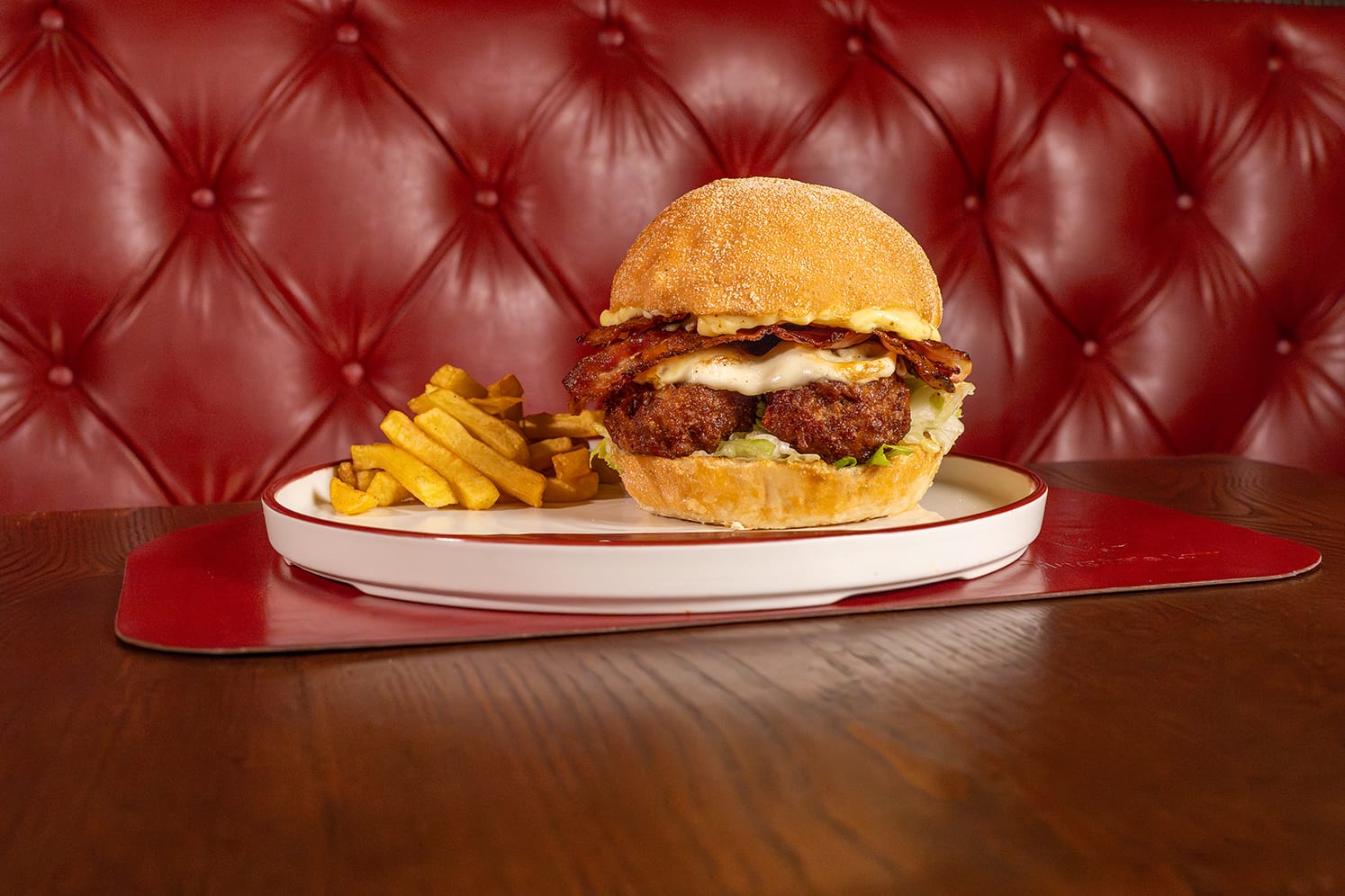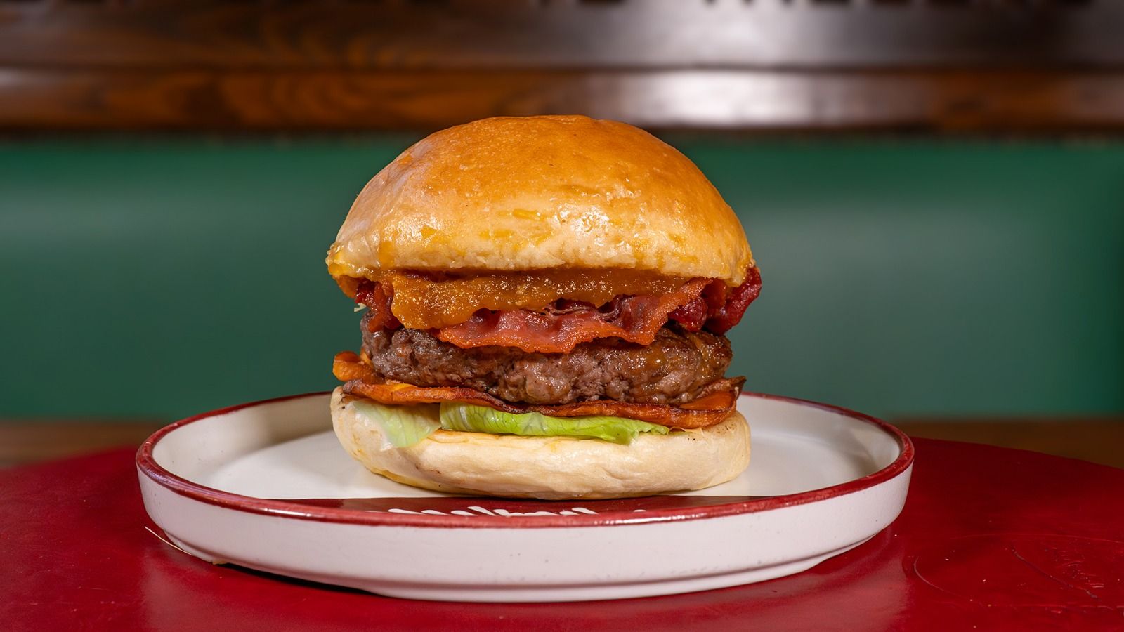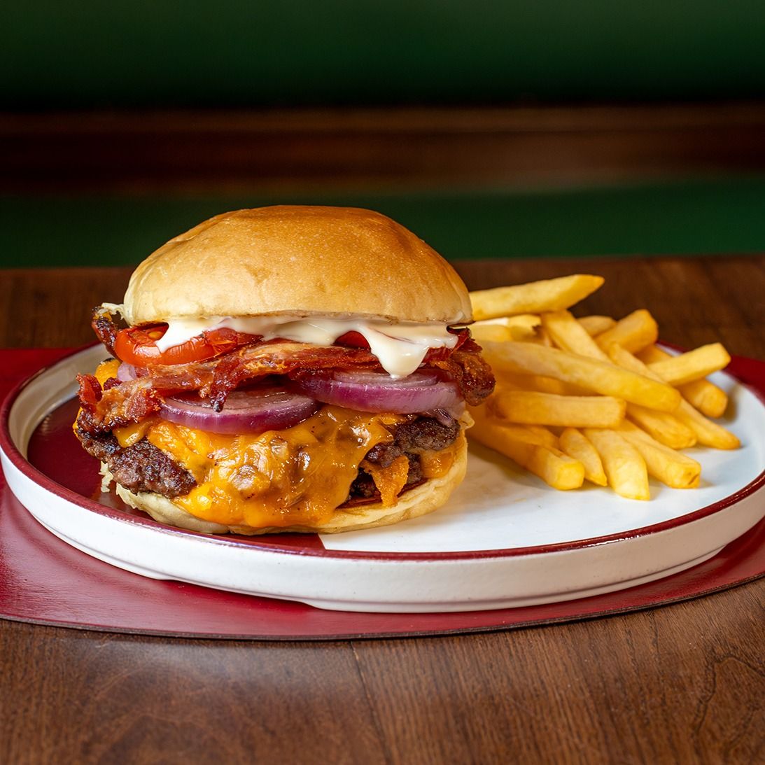 Two ML smashed hamburgers, topped with melted Red Leicester cheddar, crispy bacon, oven-roasted tomato, and caramelized Tropea onion with basil.
