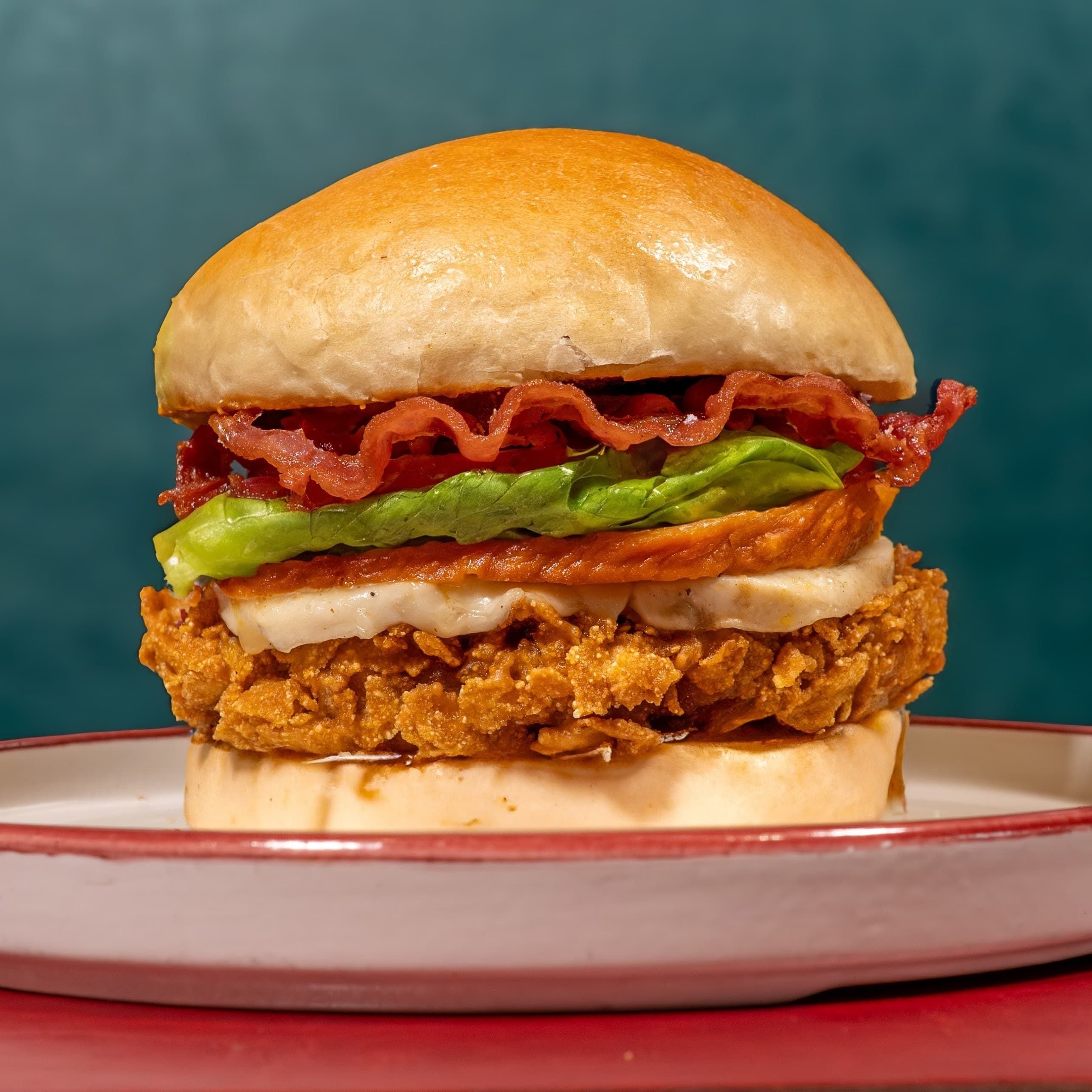 ML hamburger, breaded and fried in a crispy Jack Danielβs corn flakes crust, with melty Agerola provola cheese, crispy bacon, fresh lettuce, smoky BBQ sauce, and sweet potato chips.