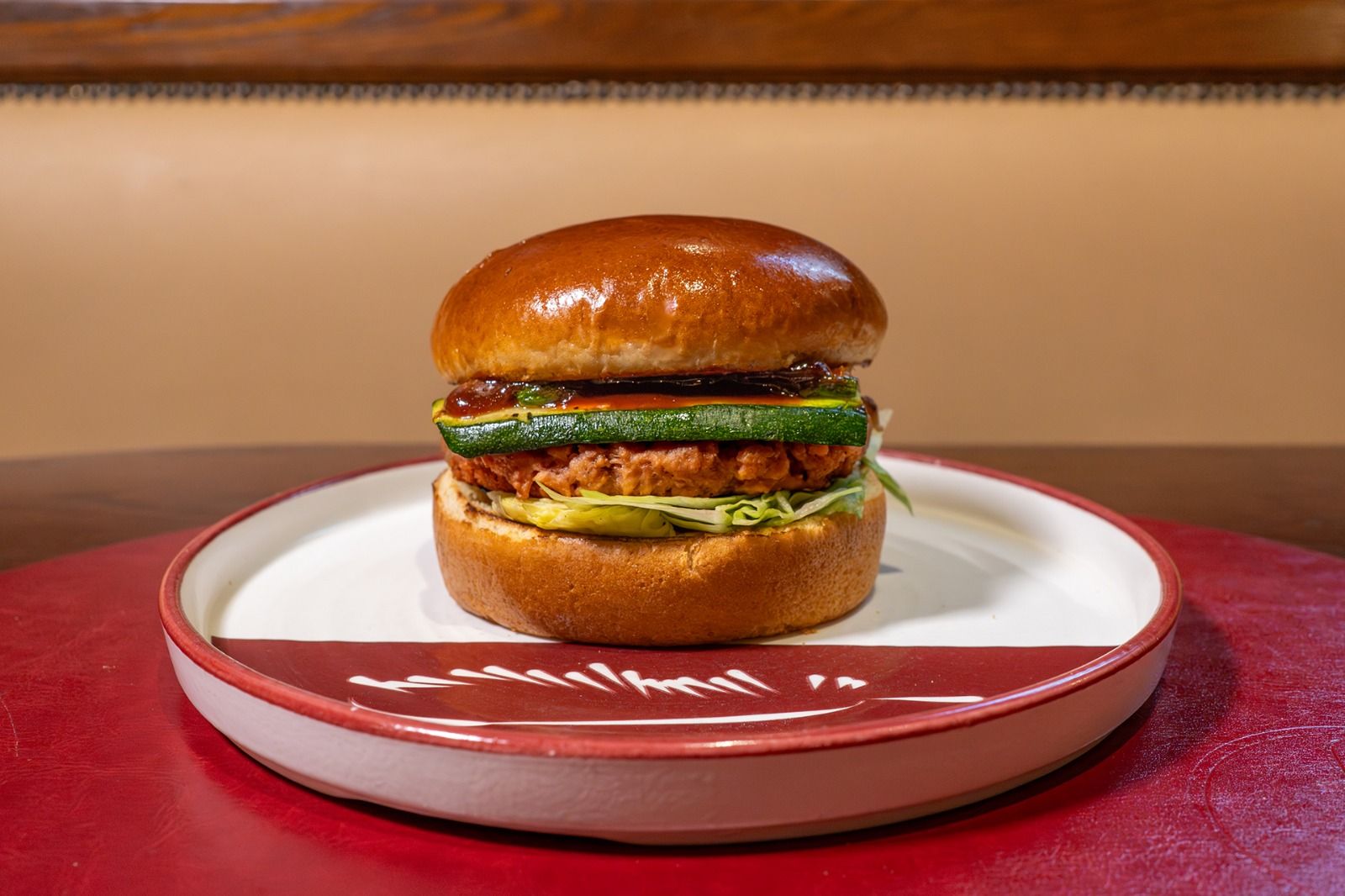 3D 100% plant-based hamburger with roasted pumpkin, fresh lettuce, and smoky BBQ sauce.