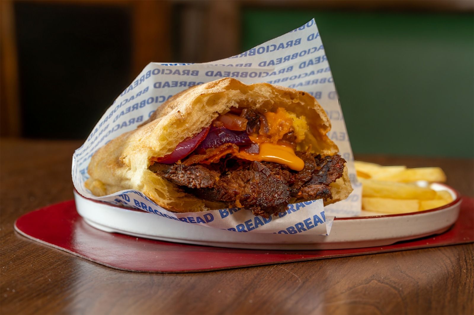 Tender homemade beef brisket with aged Red Leicester cheddar, caramelized Tropea onion, and smoky BBQ sauce.