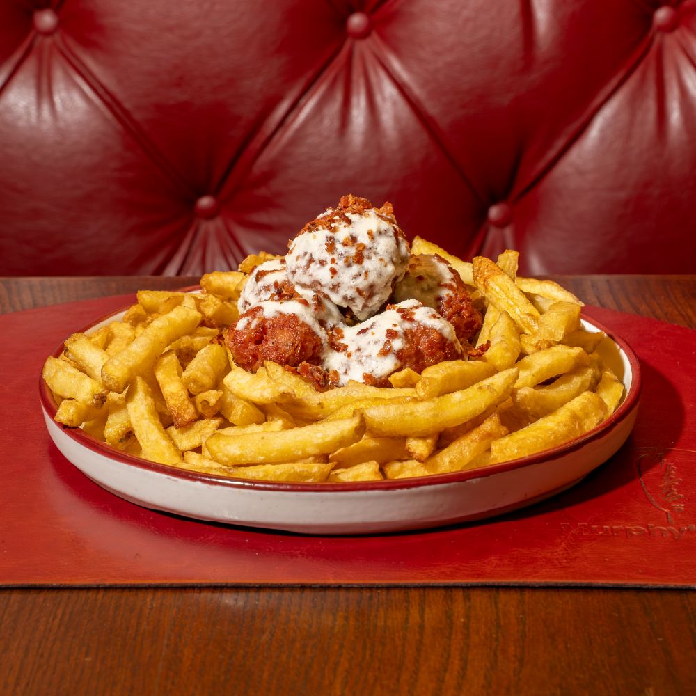 French fries with homemade beef meatballs, 4-cheese fondue, and crispy bacon.